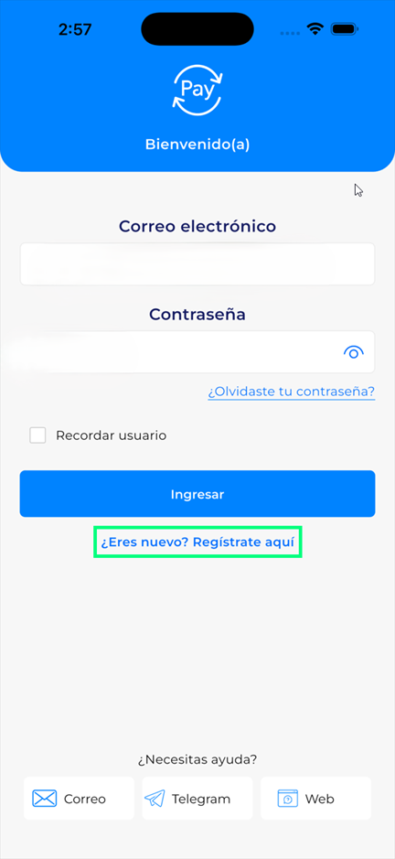 En la pantalla inicial de Pay, haz clic en la opción “¿Eres nuevo? Regístrate aquí”.