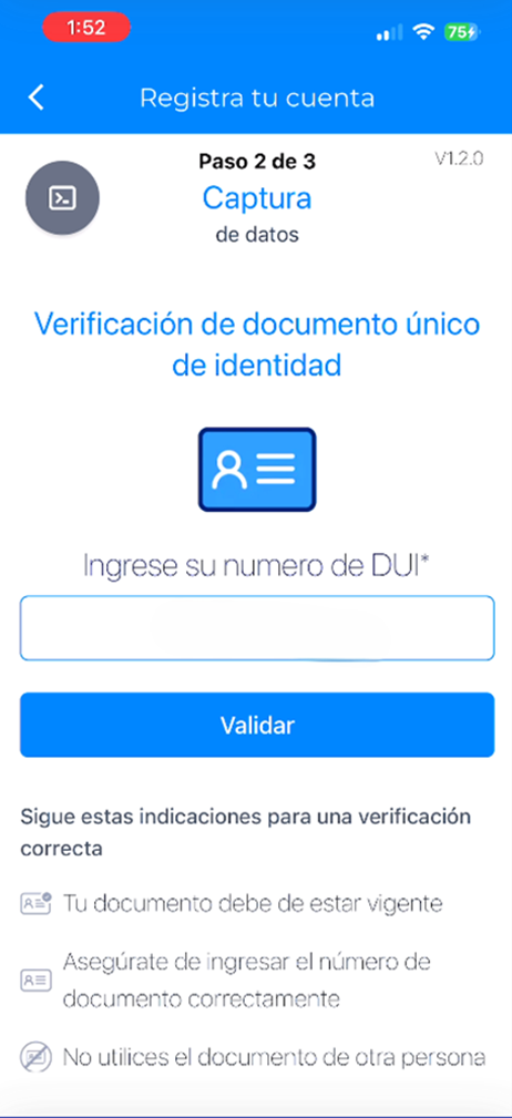 Ingresa el número de tu DUI para validar tu identidad dentro de la plataforma Pay.