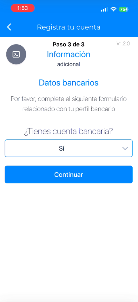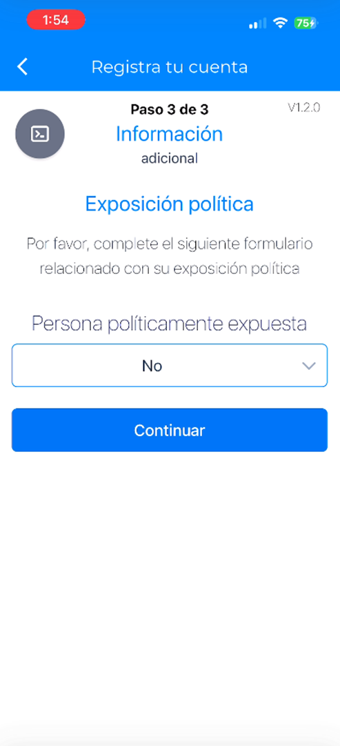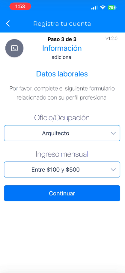 Completa los campos de oficio u ocupación, ingreso mensual y si eres persona políticamente expuesta, según tu situación. También se te consultará si posees información bancaria.