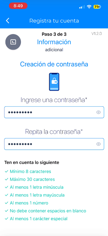 Crea una contraseña que cumpla con todos los requisitos indicados en la sección “Tomar en cuenta lo siguiente”. El proceso solo podrá finalizar cuando todos los criterios sean cumplidos.
