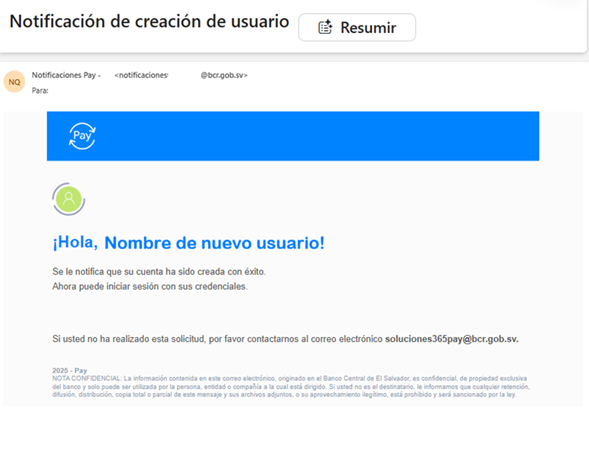 Recibirás un correo electrónico de confirmación indicando que tu usuario Pay ha sido creado correctamente.