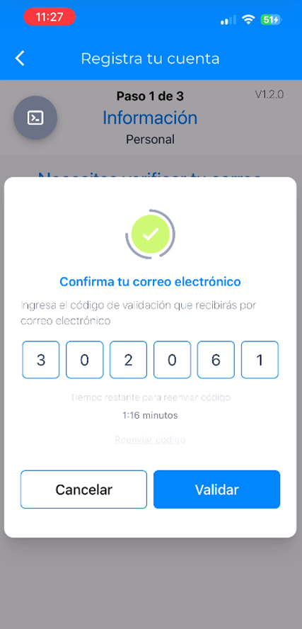 Escribe el código enviado al correo electrónico que registraste en el paso anterior.