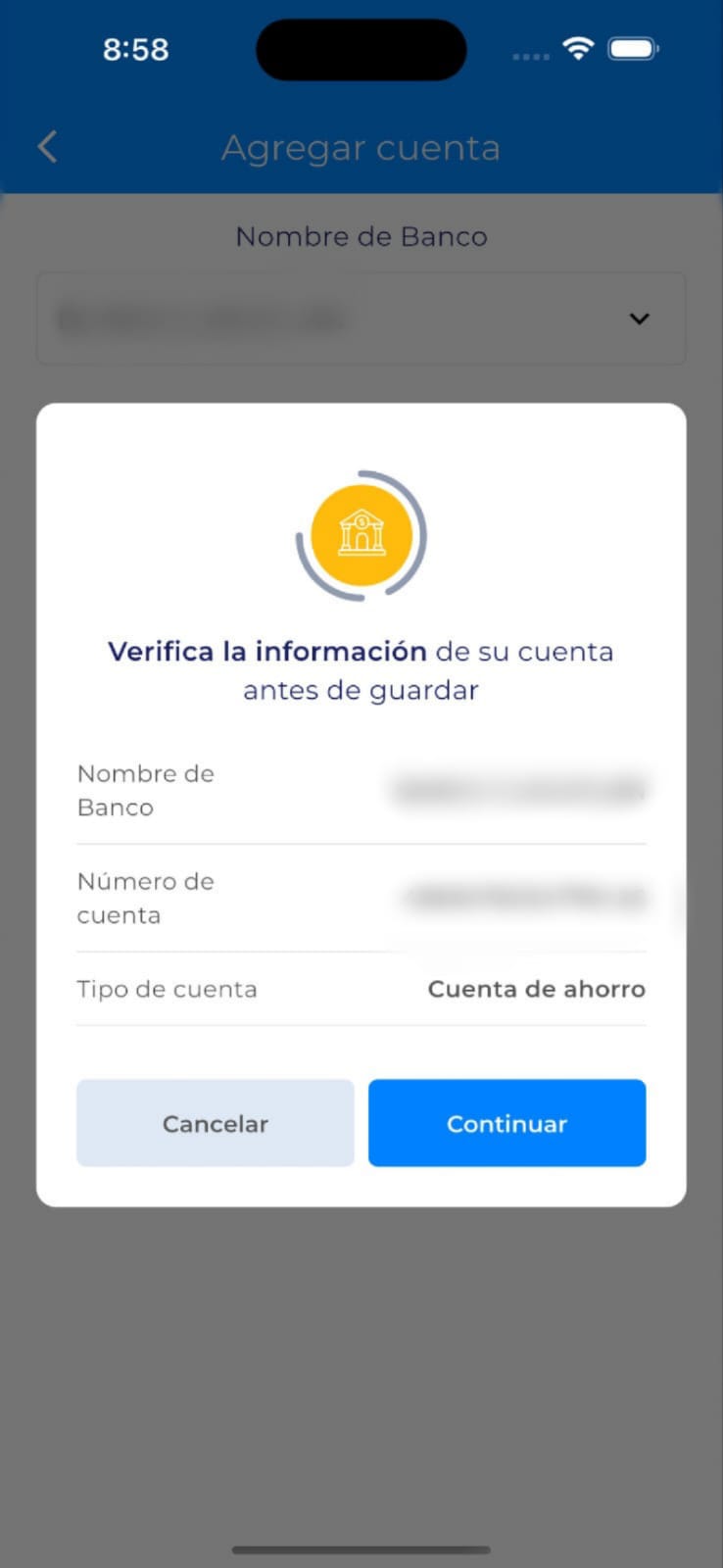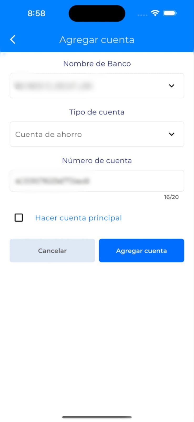 Para registrar esta cuenta bancaria, ten a disposición los siguientes datos del tercero: nombre del banco, tipo de cuenta (ahorro o corriente), número de cuenta, así como el nombre y apellido del titular.