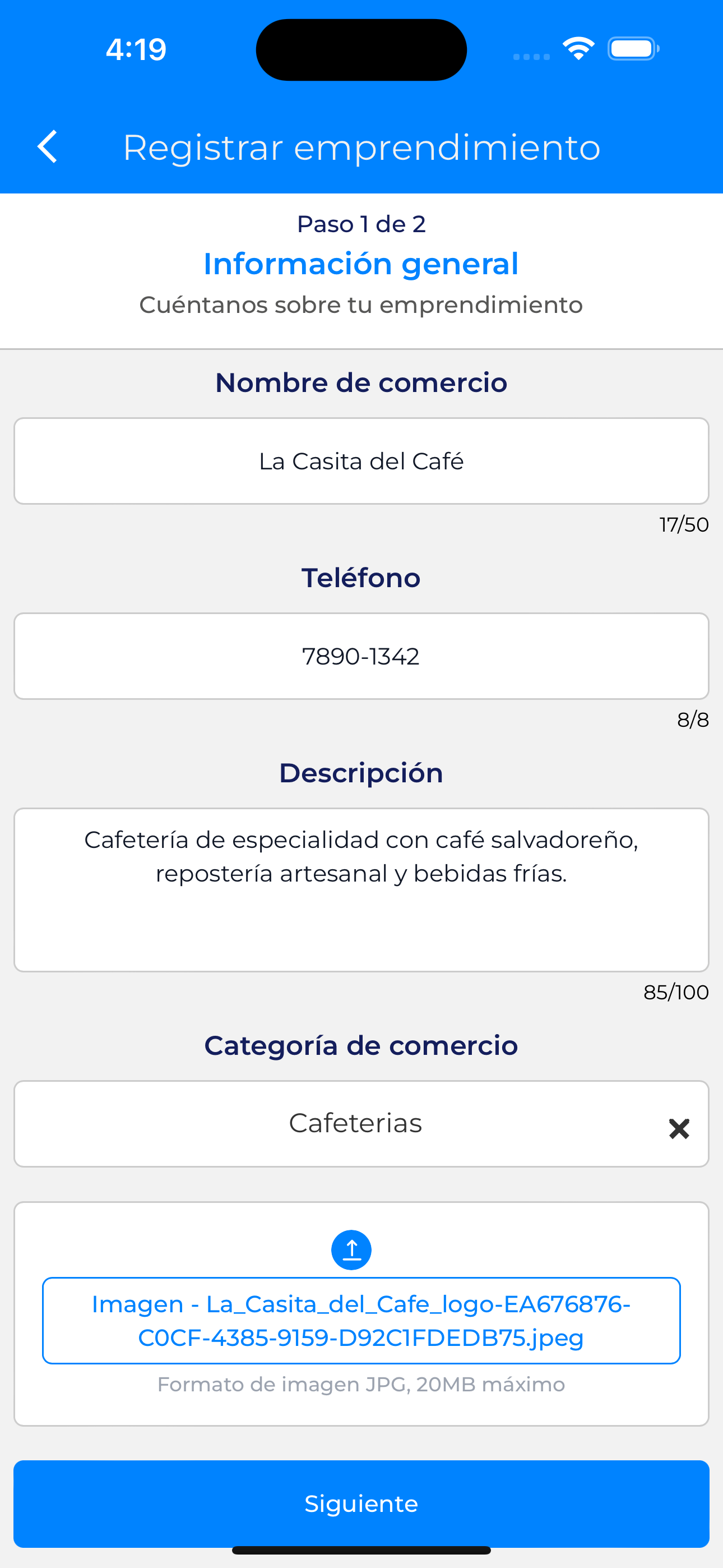 Ingresa tus datos en el formulario con los datos de tu emprendimiento/negocio, al final agrega una imagen representativa para que tus clientes identifiquen tu negocio.