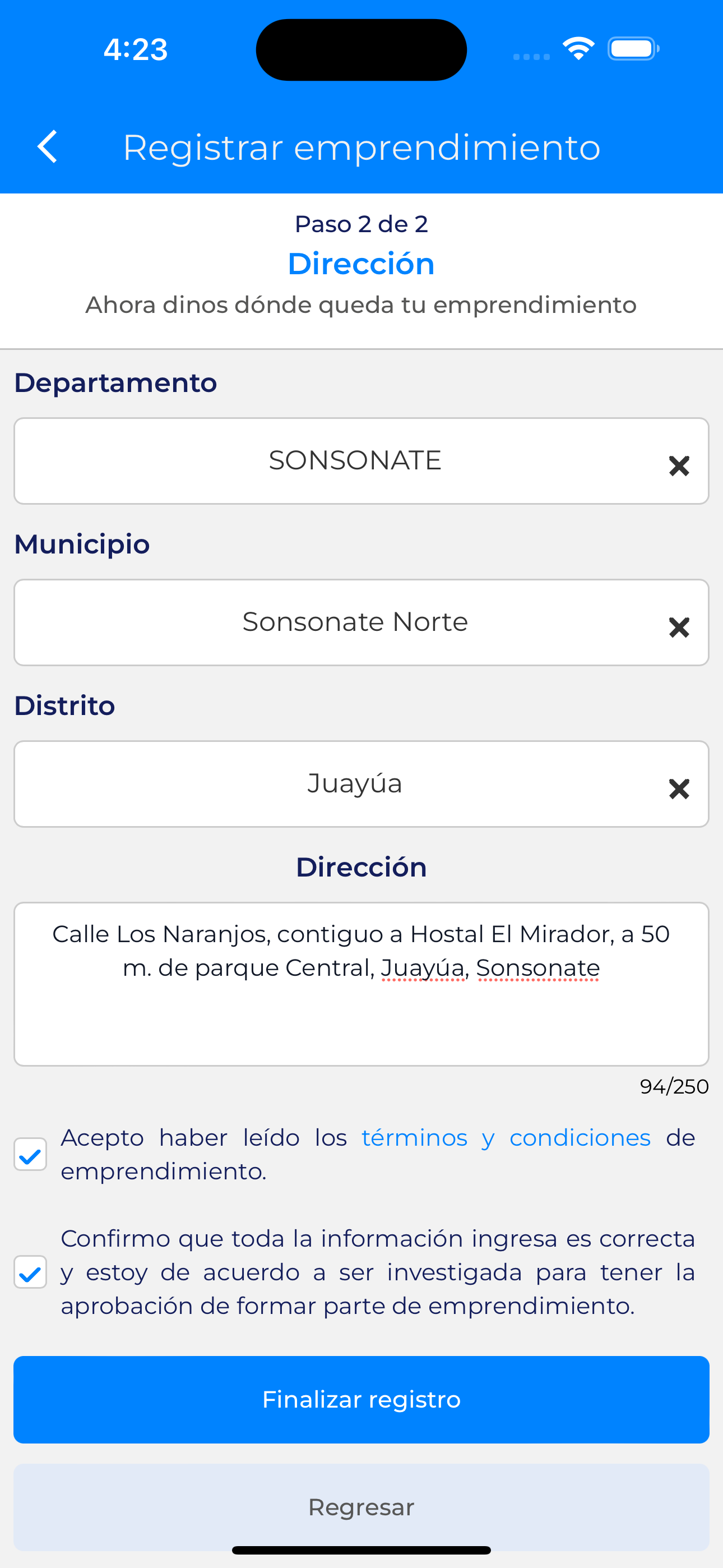 Luego ingresamos la información complementaria que nos pide a continuación y chequeamos para aceptamos los terminos y conficiones de uso de la app como emprendimiento así como de dar fé que la información ingresada es veraz.