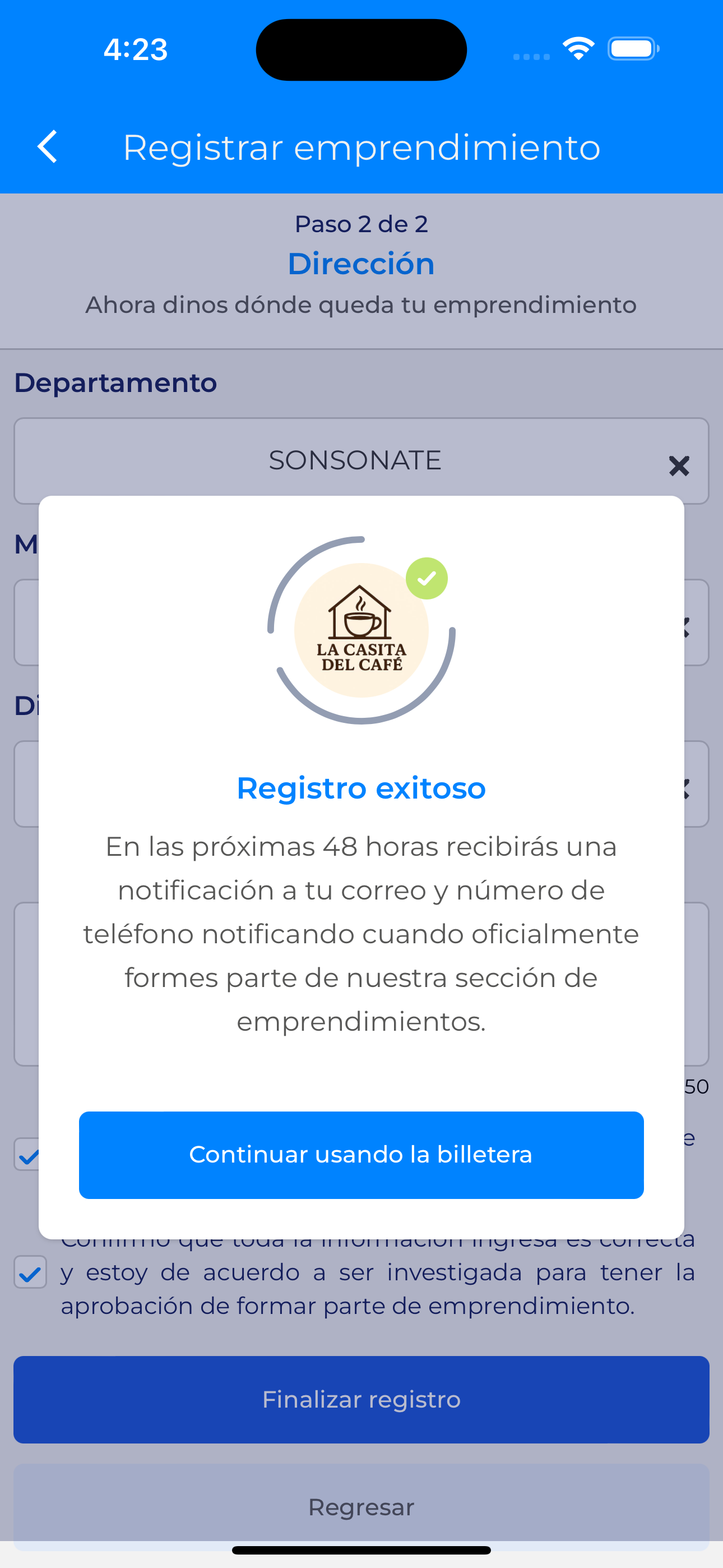 !Listo! Tu solicitud de registro para tu emprendimiento esta lista, ahora debe pasar por un proceso de validación interno por parte de BCR , si todo esta bien , será aprobado en un lapso maximo de 48 horas (normalmente es cuestión de unos minutos)