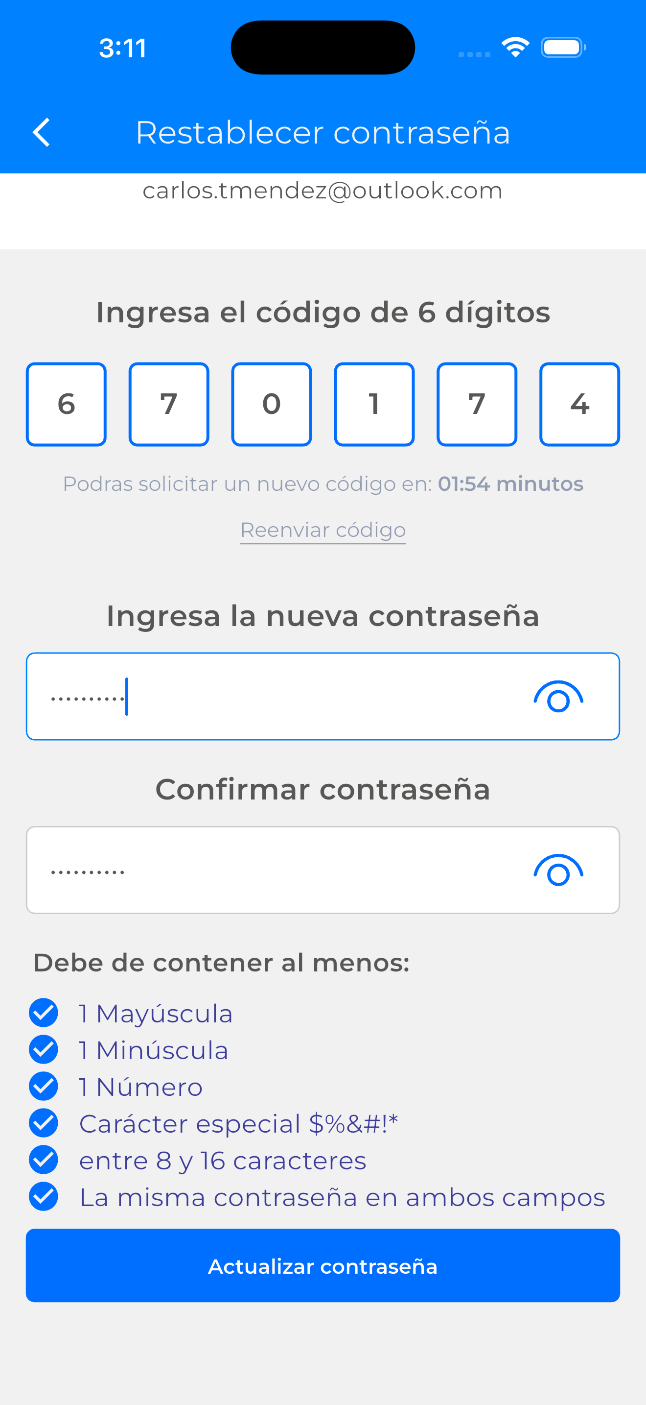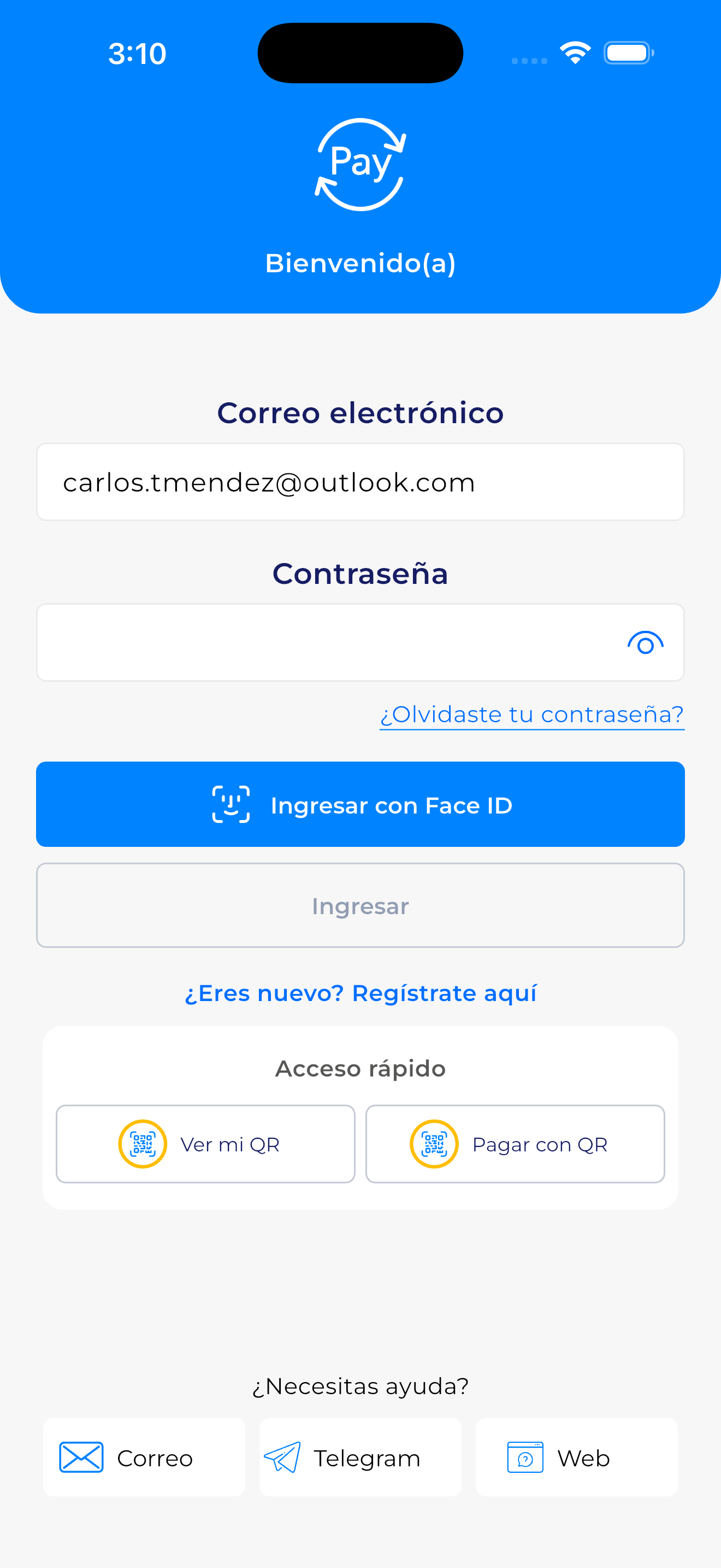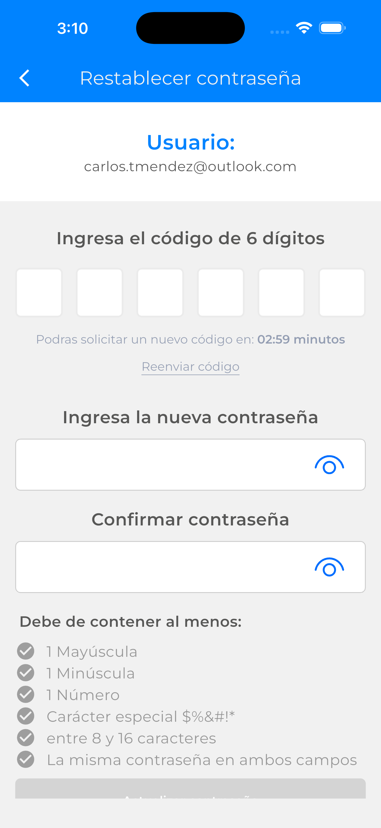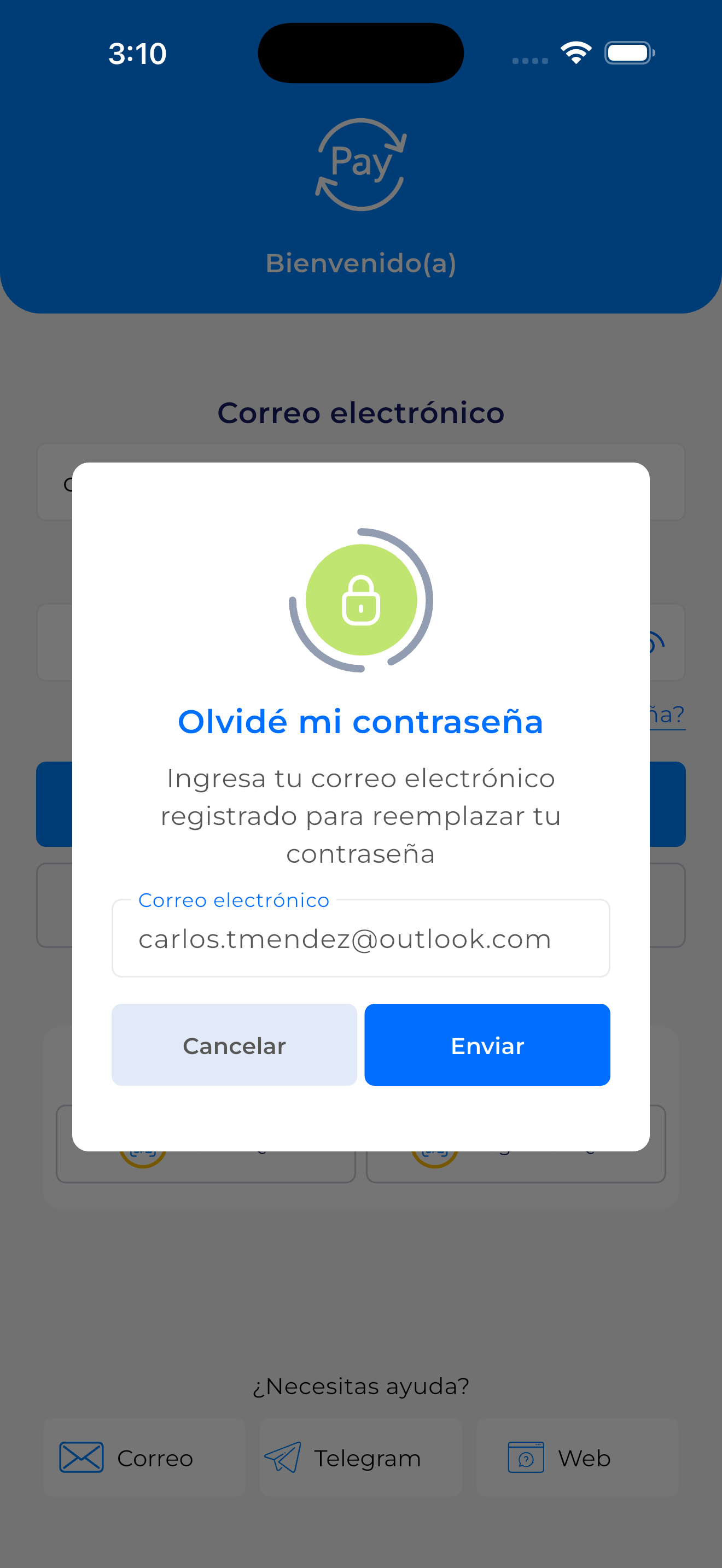 Escribe el correo electrónico con el que te registraste en Pay y toca el botón Enviar. Recibirás un código de verificación de 6 dígitos en tu correo.