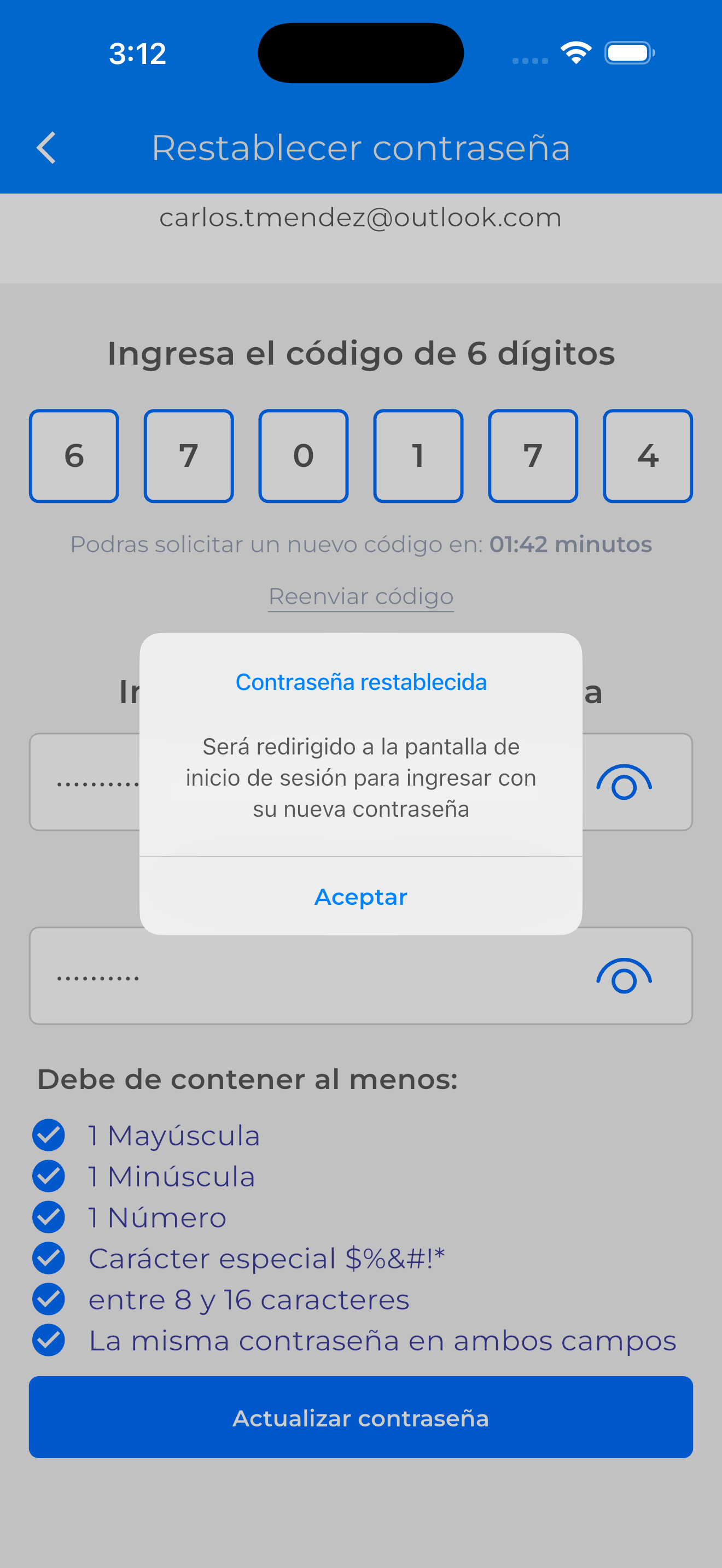 Finalmente podrás visualizar el mensaje de Contraseña restablecida.