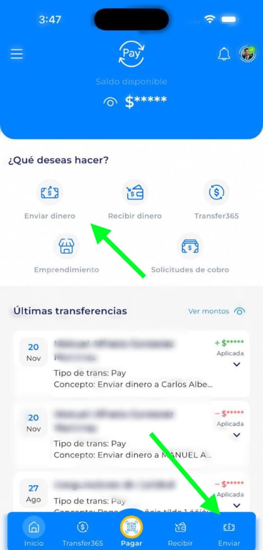 Toca 'Enviar dinero' para hacer una transferencia a otro usuario de 365Pay.