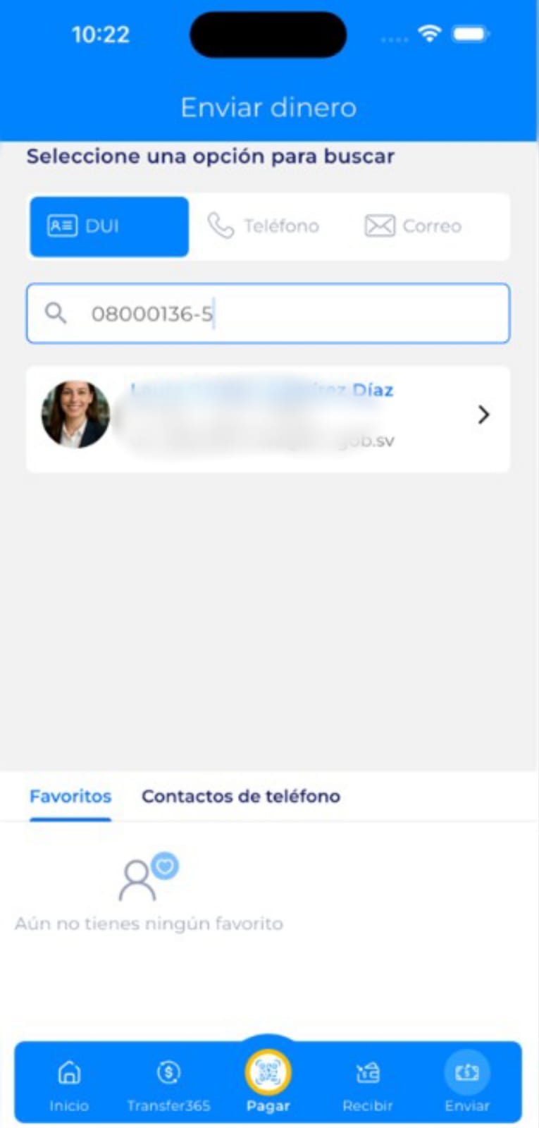 Busca usuarios de 365Pay por DUI, teléfono o correo desde el menú superior, o selecciona un contacto del teléfono desde la opción inferior. Una vez localizado el usuario solo debes tocar.