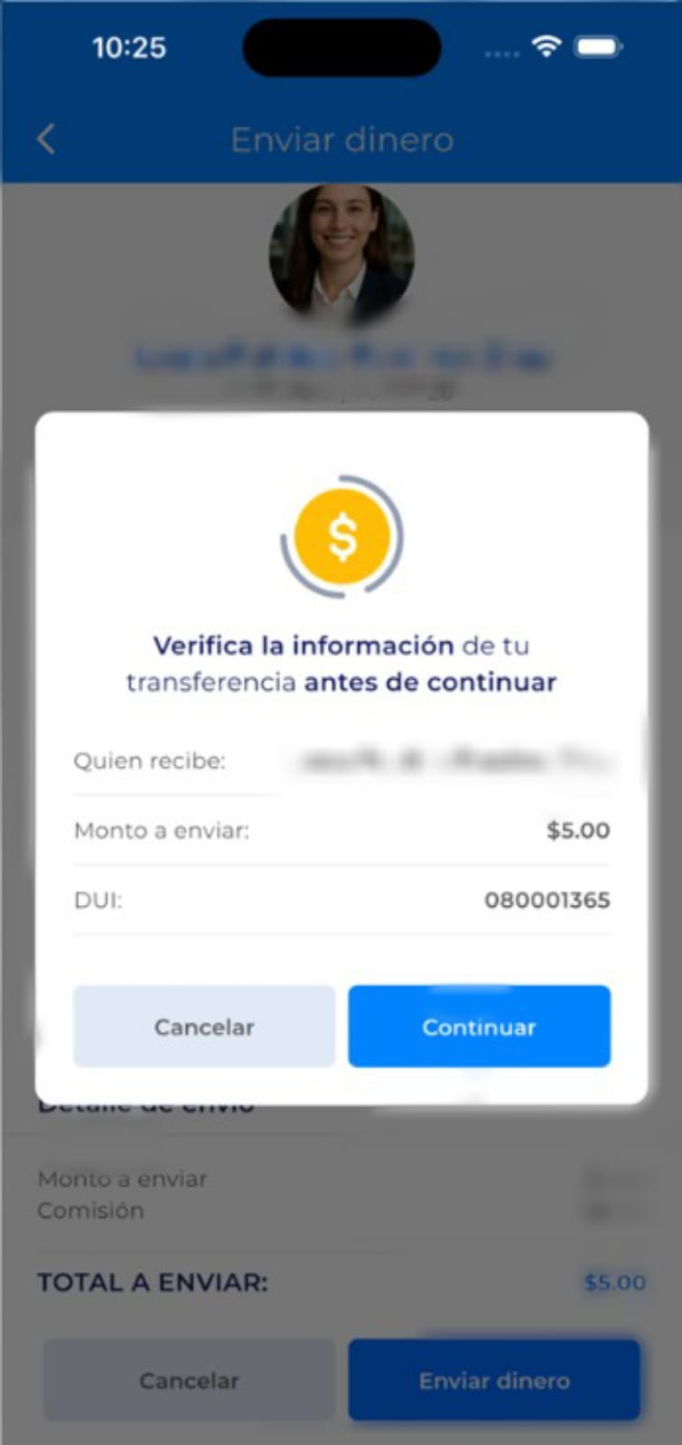 Tomate un tiempo para revisar los datos antes de registrar la transferencia económica, finalmente selecciona el botón Continuar.
