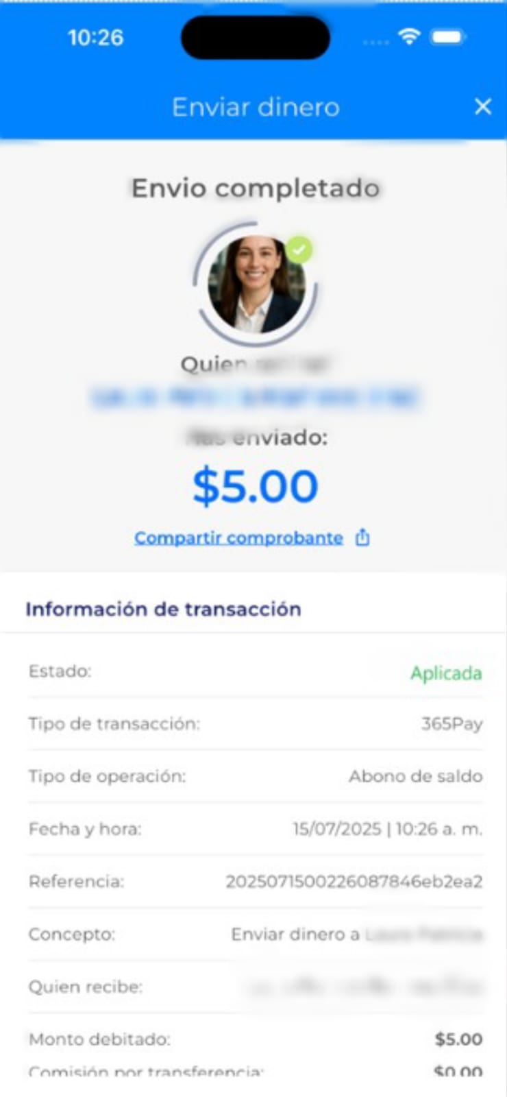 Paso 6: !Listo! Haz hecho una transferencia de dinero a otro usuario 365Pay